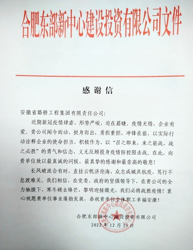 近日,合肥東部新中心建設(shè)投資有限公司發(fā)來感謝信,對(duì)安徽路橋集團(tuán)在疫情形勢(shì)嚴(yán)峻復(fù)雜的非常階段,主動(dòng)擔(dān)當(dāng)作為、夜以繼日奮戰(zhàn)在瑤海區(qū)防疫第一線,給予高度的贊揚(yáng)和衷心感謝。