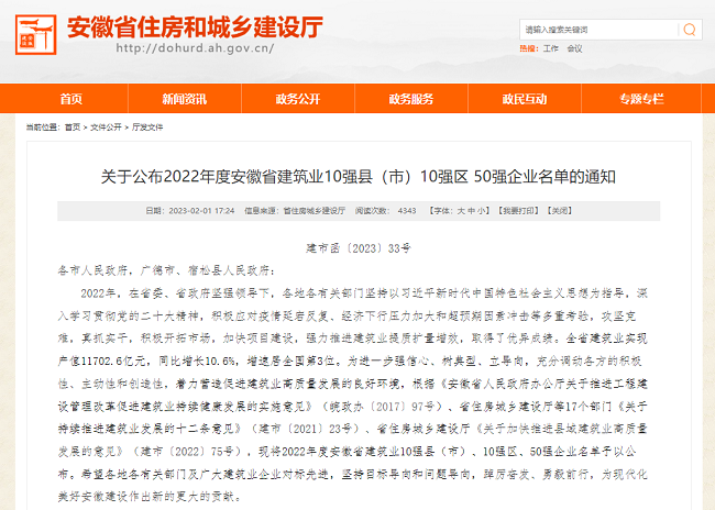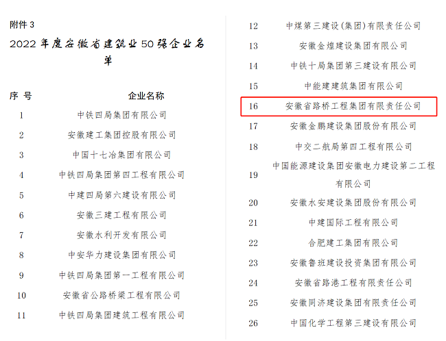 近日,省住房和城鄉建設廳公布《2022年度安徽省建筑業50強企業名單》,安徽路橋集團再次榮登榜單,位列第16位,較上一年度上升5位。合肥市蜀山區召開高質量發展暨“一改兩為”推進大會,公布了“2022年蜀山區建筑業十強企業”榜單,安徽路橋集團再次入選。頻獲殊榮,標志著公司綜合實力、行業競爭力、品牌影響力的再次提升。