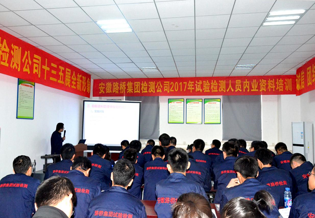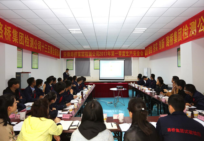 4月8日,檢測公司在肥召開2017年試驗檢測人員內業資料培訓暨第一季度生產安全會,會議由檢測公司副總經理佐群主持。路橋集團黨委委員、總工程師王潔蒞臨會議并作重要講話。檢測公司領導班子成員、機關各部門、各項目試驗室負責人近五十人參加會議。