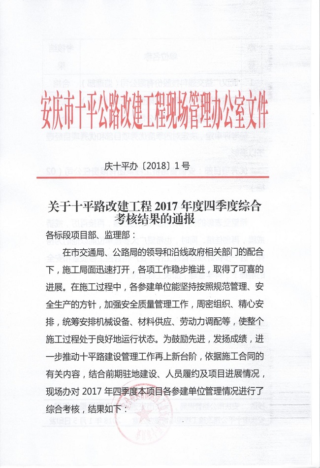 1月5日,我公司承建的安慶市十平公路改建工程項目在業主開展的2017年度四季度綜合考評中取得優異成績,受到業主表彰。項目部被授予“優秀項目部”稱號,洪本安同志被授予“優秀項目經理”稱號。