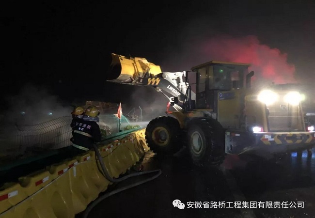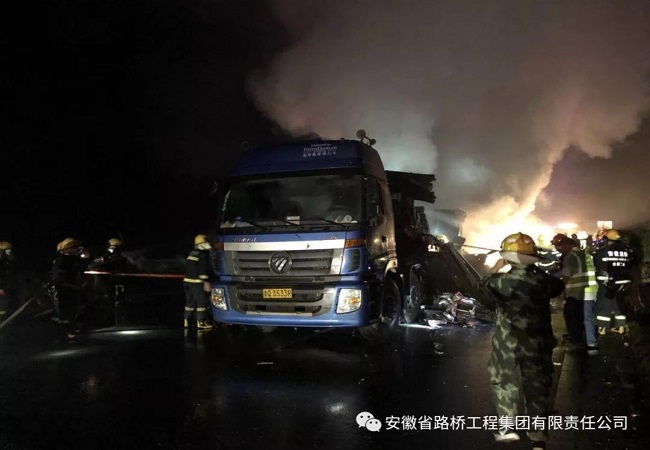 5月12日晚22點50分,合安高速往合肥方向1053+100路段有車輛著火,占據了超車道和行車道,導致往合肥方向交通雙向中斷。現場火勢很大,并伴有清晰的爆裂聲。形勢危急,合安項目部副經理李虎、安全部總監楊林第一時間趕到現場指揮救援,安全部以及拌合站工作人員也趕到現場,積極配合消防隊、交管隊進行火災搶險行動。經過一夜奮戰,大火最終被撲滅。7點26分,消防隊二次進場將余火撲滅后,合安項目部立即組織工作人員快速清理現場,保證了道路的通暢。