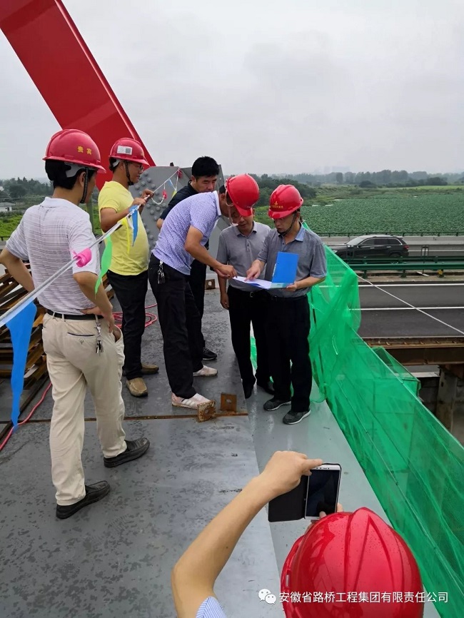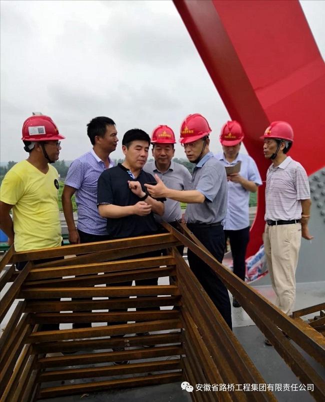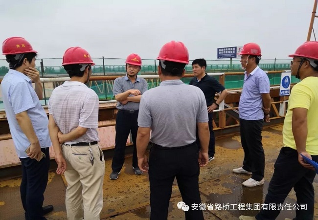 7月5日上午,安徽省交通控股集團總工程師胡可一行蒞臨合安項目中派河特大橋調研指導工作,項目辦主任吳建民、副主任鄧陳記、項目經理郭永剛、副經理陸勤龍陪同調研。