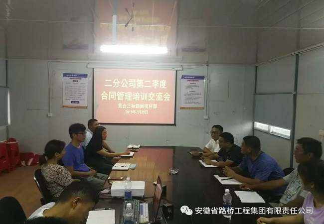 7月20日晚,二分公司第二季度合同管理培訓交流會在蕪合高速03標路面項目部召開。會議由蕪合高速03標路面項目經理李健、副經理葛繼銀主持,蕪湖東項目負責人曹軍主講,各項目合同管理人員參加會議。