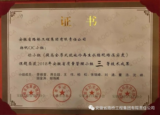 7月22日—7月25日,由安徽省質量管理協會、安徽省總工會、安徽省婦女聯合會、安徽省科學技術協會主辦的2018年度安徽省質量管理小組成果展示交流會在安徽黃山召開,全省各地市、各行業共355個優秀成果參加此次發布會,此次大會的參賽小組數、發布成果數均為歷年之最。由公司選送的揚帆QC小組《提高全厚式就地冷再生水穩現場施工現場壓實度》課題榮獲2018年安徽省質量管理小組三等技術成果。