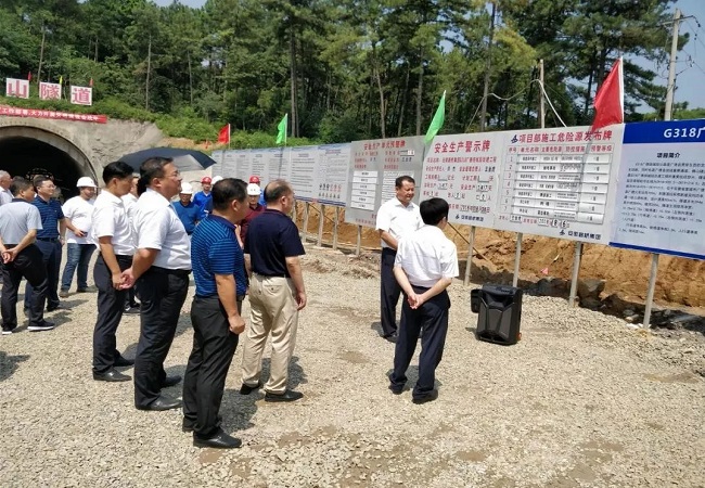 8月6日上午,廣德縣縣委書(shū)記王慶武、縣長(zhǎng)陳紅英、縣人大主任程利、縣政協(xié)主席周鳳月及縣委、縣政府、人大、政協(xié)等相關(guān)領(lǐng)導(dǎo)同志一行70余人,蒞臨G318廣德縣繞城段公路改建工程項(xiàng)目,視察橫山隧道。項(xiàng)目業(yè)主、監(jiān)理及施工單位相關(guān)負(fù)責(zé)人陪同縣領(lǐng)導(dǎo)地參觀施工現(xiàn)場(chǎng),觀摩現(xiàn)場(chǎng)安全、施工介紹展板,聽(tīng)取了G318廣德繞城路有關(guān)介紹與進(jìn)度情況、工作計(jì)劃。