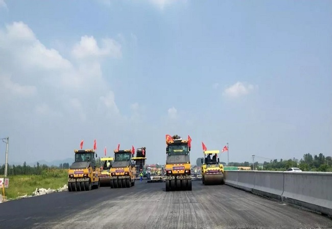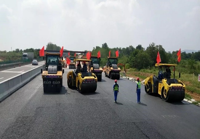 施工現(xiàn)場(chǎng)有16名工人來(lái)回忙碌,2臺(tái)福格勒2100-3L瀝青攤鋪機(jī)、10臺(tái)壓路機(jī)轟鳴作業(yè),160℃的瀝青下面層攤鋪在地面上,散發(fā)出陣陣青煙,現(xiàn)場(chǎng)熱浪一陣陣撲面而來(lái),員工們大干的激情格外飽滿(mǎn)。