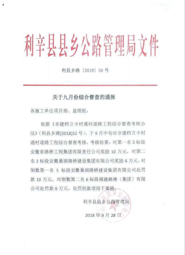在剛剛結束的9月利辛縣非建檔立卡村通村道路工程綜合督查考核中,公司承建的利辛縣非建檔立卡村通村道路施工3標段在全線6個標段中榮獲第一名,并獲業主獎勵10萬元,為接下來的四季度大干,圓滿完成項目年度任務目標開了好頭。