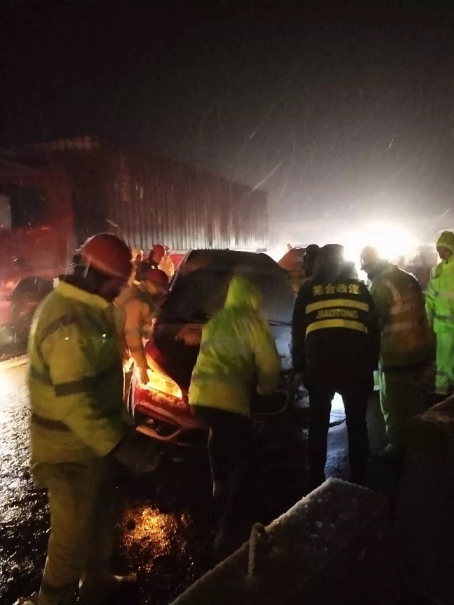 傍晚時分,高速上一輛載有老人小孩的車撞上了隔離墩,車輛上的人員滯留在高速上,志愿者們第一時間到達現場幫忙推車疏導交通,并給他們送去熱氣騰騰的晚飯,老人激動的握住志愿者冰涼的手表達感謝,絲絲暖意縈繞在彼此之間。惡劣天氣加上追尾事故,車輛都擁堵在高速上,在項目領導班子及團支部書記的帶領下,項目部全員在現場進行幫扶救援,撒鹽化雪、推車、扶正隔離墩、維護現場秩序......漫天雪花中,一個個忙碌的明黃色身影為這個寒冬增添了一抹暖色,展現了路橋集團人“不畏嚴寒、樂于助人”的奉獻精神。