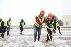 項(xiàng)目部調(diào)動(dòng)機(jī)械設(shè)備鏟雪,對(duì)各路段撒融雪劑除雪,同時(shí)組織員工利用鐵鍬、鐵耙、掃帚等工具清理積雪,始終保障路面不積雪,消除安全隱患,為廣大合肥市民出行提供便利。雖然員工們手腳被寒風(fēng)凍麻,衣服和鞋襪早已被雪水、汗水浸濕,但是大家依然卯足干勁、埋頭掃雪,現(xiàn)場(chǎng)清雪工作干得熱火朝天,這些最可愛(ài)的人為合肥在這個(gè)冬日雪天增添一份溫暖。