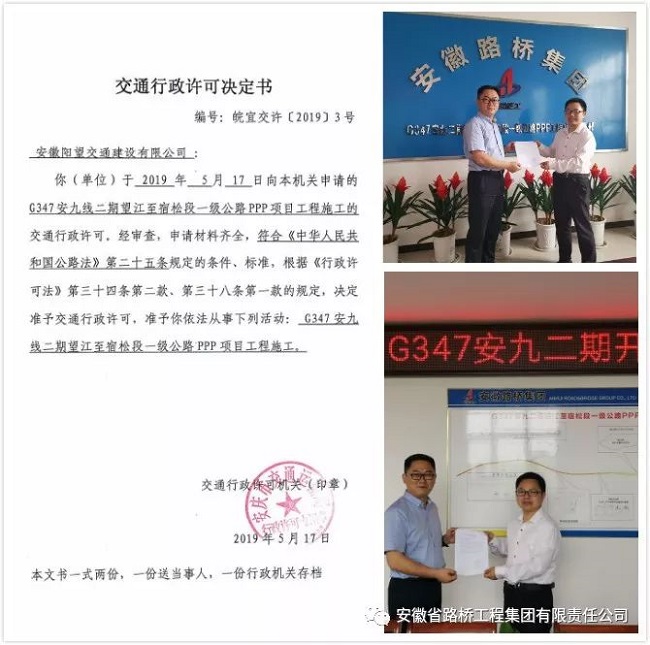 為加快項目建設進程,隨后朱科長一行來到項目公司會議室主持開展了行政審批“六進”服務會議,現場受理、現場勘察、現場審批、現場發證、現場辦結,把審批直接延伸到項目施工現場。會議最后,朱科長代表安慶市交通運輸局將《交通行政許可決定書》頒發給項目公司。這標志著望江PPP項目的所有前期材料已基本辦理完成,全面施工已具備先行條件。