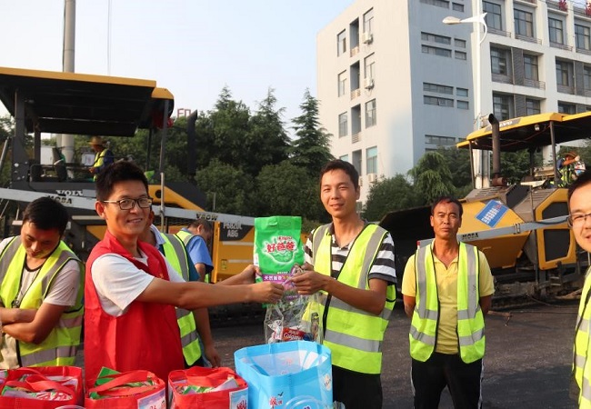 伴隨著熹微晨光,項(xiàng)目部早早將慰問(wèn)品整整齊齊的擺放在施工現(xiàn)場(chǎng)。活動(dòng)開(kāi)始,項(xiàng)目黨支部書(shū)記、項(xiàng)目總工趙高鵬向現(xiàn)場(chǎng)所有施工人員宣貫了建工集團(tuán)“搶進(jìn)度、保工期、穩(wěn)預(yù)期、促提升”勞動(dòng)競(jìng)賽方案,號(hào)召現(xiàn)場(chǎng)所有技術(shù)人員、施工班組抓住當(dāng)前晴好天氣,齊心協(xié)力,為完成項(xiàng)目任務(wù)目標(biāo)而努力。隨后,項(xiàng)目部為現(xiàn)場(chǎng)瀝青攤鋪工人及機(jī)械設(shè)備操作手發(fā)放了毛巾、洗發(fā)水、洗衣粉等洗漱用品。