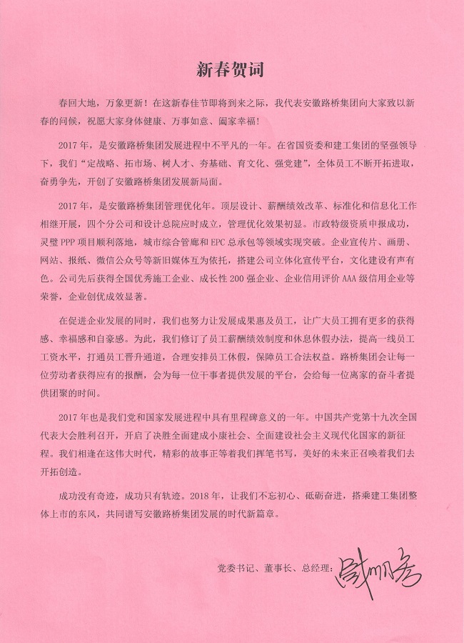 春回大地,萬象更新!在這新春佳節即將到來之際,我代表安徽路橋集團向大家致以新春的問候,祝愿大家身體健康、萬事如意、闔家幸福!