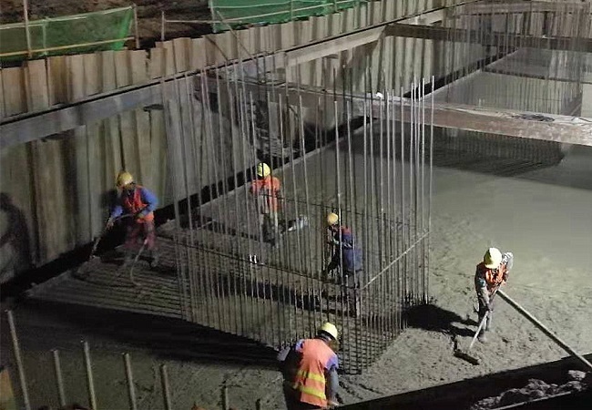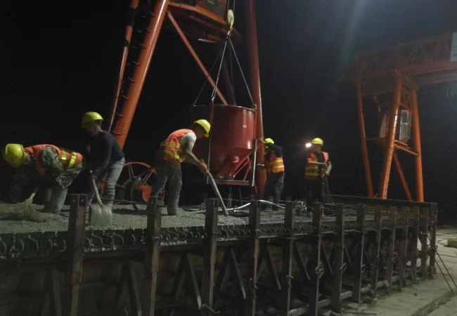 縣河大橋主橋結構形式為25m+55m+25m預應力鋼筋混凝土梁拱組合橋,主跨為55m的下承式系桿拱橋,5#主墩承臺設計尺寸24m*8m*2.5m,設計方量480m3,歷時13個小時澆筑完成。在項目部的精心組織和施工班組的積極配合下,當日22時,縣河大橋5#主墩承臺和首片預制箱梁澆筑順利完成。