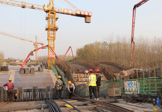 卓越溪橋主拱圈厚1.2米,跨徑46米,采用C50砼,澆筑面積大,方量多。項目部對此高度重視,精心籌劃,采用兩聯內外跨同步對稱澆筑的方式,既滿足了澆筑速度、澆筑質量又滿足場地空間限制及支架安全穩定要求。本次0#-1#右幅邊跨的順利澆筑,項目部在組織安排、物資準備、機械準備方面積累了經驗,為全橋主拱圈混凝土澆筑施工提供了強有力的技術支撐,為腹拱圈及橋面鋪裝施工奠定了堅實的基礎。同時,黑龍江路至卓越溪橋頭段側石施工、山東路至重慶路段灰土、電排工程也在緊鑼密鼓地施工中。