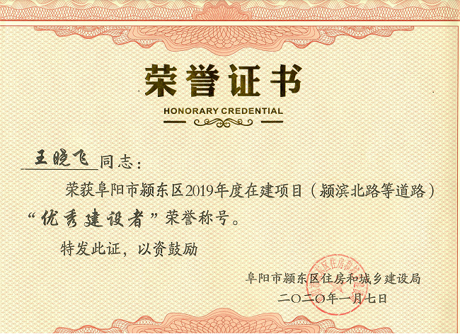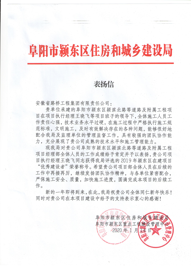 1月14日,安徽路橋集團五分公司阜陽潁東區(qū)道路項目收到阜陽市潁東區(qū)住建局和區(qū)重點工程建設(shè)管理中心聯(lián)合發(fā)來的表揚信。業(yè)主單位在信中對阜陽潁東區(qū)道路項目經(jīng)理部在施工過程中表現(xiàn)的團隊協(xié)作精神、專業(yè)技術(shù)水平及施工管理能力給予了高度贊揚,對路橋集團在項目建設(shè)中給予的支持表示衷心的感謝。項目部生產(chǎn)副經(jīng)理王曉飛同志榮獲住建局評選的2019年度阜陽潁東區(qū)在建項目“優(yōu)秀建設(shè)者”榮譽稱號。