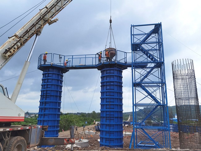 為保證橋梁下部構造順利施工,實現橋梁工序快速銜接轉換,項目部以施工進度為抓手,統籌謀劃,增加班組人員配備,配足模板、安全爬梯等物資設備。強化管理人員及施工人員的安全技術培訓,細化質量管理技術措施,做好高溫、雨季及高空作業安全防控工作,及時消除安全隱患,確保安全生產。