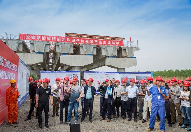 20日下午2:00,與會(huì)專家學(xué)者及代表一行乘車前往安徽路橋集團(tuán)合安改擴(kuò)建01標(biāo)中派河大橋施工現(xiàn)場(chǎng)觀摩。公司領(lǐng)導(dǎo)班子、工程管理部、總師室、設(shè)計(jì)院、合安改擴(kuò)建01標(biāo)項(xiàng)目接待了觀摩團(tuán)一行。項(xiàng)目負(fù)責(zé)人向觀摩團(tuán)詳細(xì)介紹了中派河大橋設(shè)計(jì)理念、施工重難點(diǎn)、施工工藝、科技創(chuàng)新、安全質(zhì)量管理等內(nèi)容。觀摩團(tuán)在參觀完施工現(xiàn)場(chǎng)后,對(duì)于中派河大橋的施工及我公司管理水平給予高度評(píng)價(jià)。
