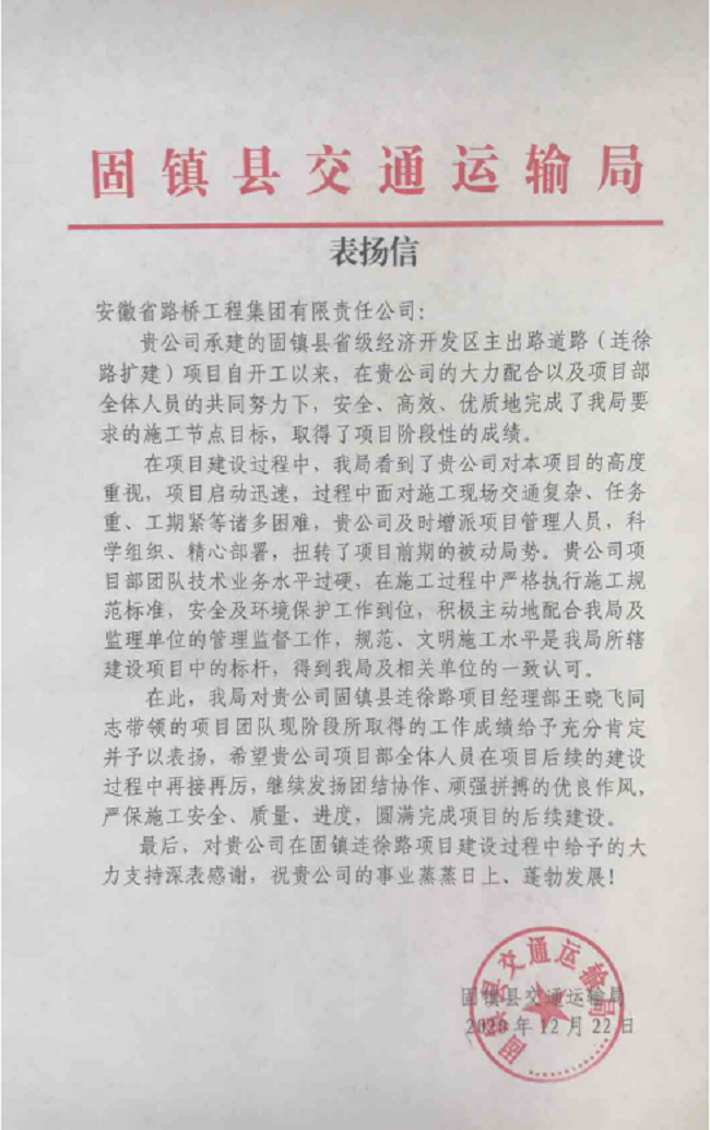 12月22日,五分公司固鎮(zhèn)連徐路項(xiàng)目收到了業(yè)主單位固鎮(zhèn)縣交通運(yùn)輸局發(fā)來的表揚(yáng)信。信中,業(yè)主單位高度肯定了項(xiàng)目所取得的階段性成績(jī),稱贊我公司在施工過程中嚴(yán)格執(zhí)行施工規(guī)范標(biāo)準(zhǔn),安全及環(huán)境保護(hù)工作到位,積極主動(dòng)地配合管理監(jiān)督工作,項(xiàng)目規(guī)范、文明施工水平是固鎮(zhèn)縣交通運(yùn)輸局所轄建設(shè)項(xiàng)目中的標(biāo)桿。