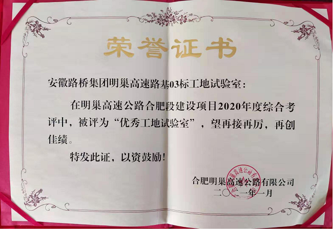 1月13日,在明光至巢湖高速公路合肥段建設項目2020度綜合考評中,檢測公司工地試驗室榮獲“優秀工地試驗室”榮譽稱號,是眀巢高速合肥共7個工地試驗室中唯一的優秀工地試驗室。繼滁天高速04標工地試驗室后,檢測公司再獲“優秀工地試驗室”榮譽稱號。