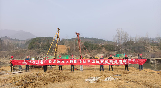 1月16日上午9點,牛嶺水庫庫區道路施工項目星潭橋首根樁基順利開鉆。