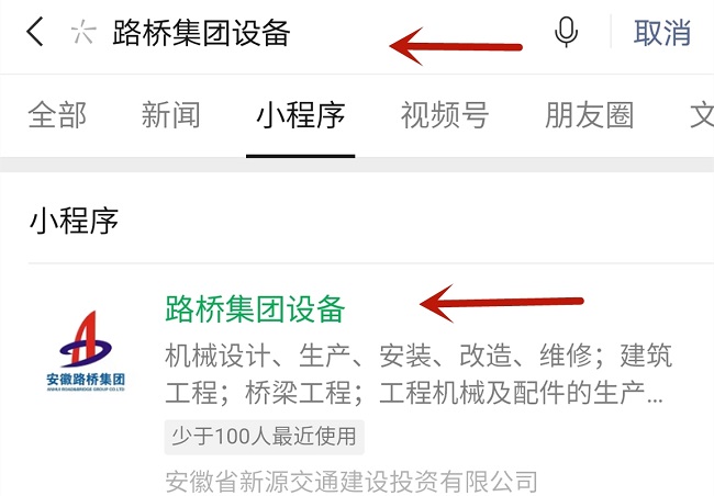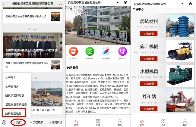 用戶可在微信小程序中添加“路橋集團設備”即可進入小程序主頁,或者進入公司公眾號后,點擊左下角“我們”后,進入“路橋集團設備”,即可進入小程序主頁。