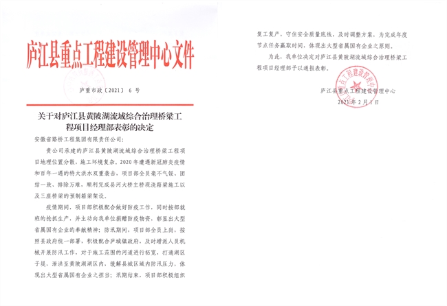 近日,業主單位廬江縣重點工程建設管理中心對廬江縣黃陂湖流域綜合治理橋梁工程項目經理部高標準完成施工任務予以通報表彰。