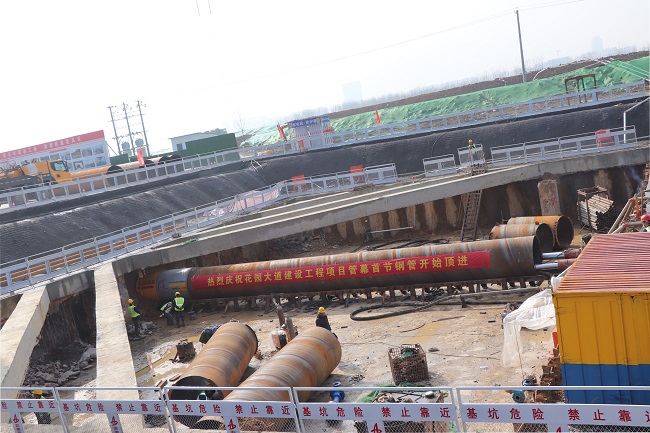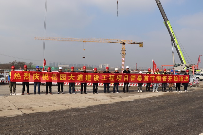 3月2日9時18分,安徽路橋集團花園大道(徽州大道-包河大道)建設工程隧道管幕首節鋼管開始頂進。