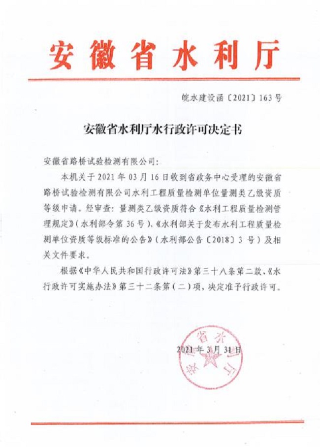 3月31日,經安徽省水利廳審查核發,安徽省路橋試驗檢測有限公司正式獲批水利工程質量檢測單位量測類乙級資質,成功進入水利工程質量檢測系統,成為安徽省檢測機構中為數不多的同時具有交通、水利行業檢測資質的企業。