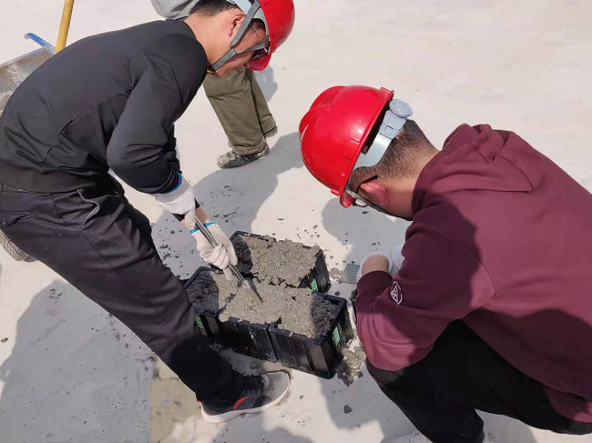本標段共有21座裝配式通道,其中4座管涵、17座箱涵。本次預制箱涵節段為1-4.0×3.5米側墻,采用C40混凝土。施工前,項目管理人員對鋼筋骨架質量、模板拼縫、預留鋼筋位置等各項指標嚴格把控,在施工過程中,項目班子全程盯控、指導裝配式箱涵首件澆筑,現場進行混凝土坍落度試驗并制作同期養護試塊,確保了裝配式箱涵預制首件的順利澆筑。