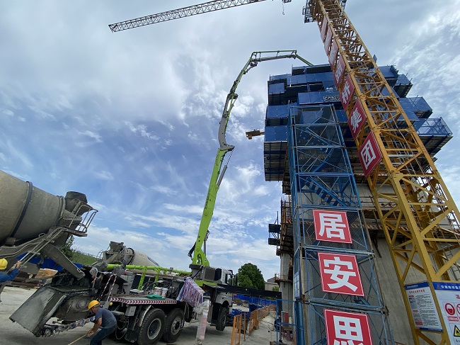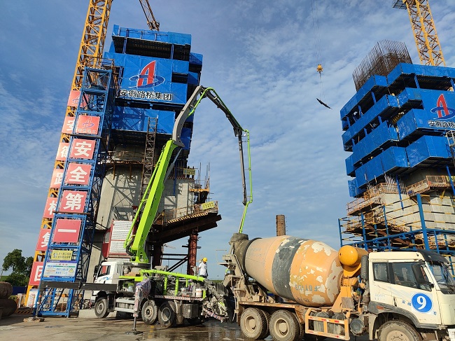 楊灣河特大橋14#墩主塔左幅第四節(jié)頂口高度24m,澆筑方量114方C50混凝土,15#墩主塔右幅第四節(jié),頂口高度24m,澆筑方量113方C50混凝土。為確保該橋的施工進度,項目部組織協(xié)調(diào)分段施工,精心編制施工方案,及時優(yōu)化施工工藝,采用降低水化熱技術不斷交流施工細節(jié)和經(jīng)驗,在確保質(zhì)量的情況下,堅持“快”字當先,及時制定相應措施,確保主塔節(jié)點澆筑成功。