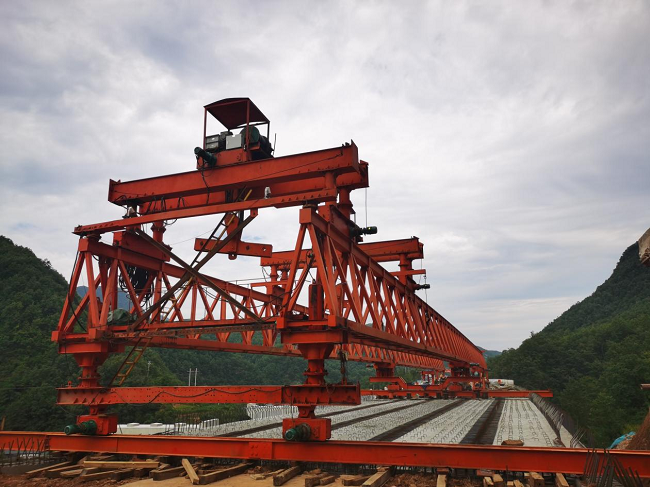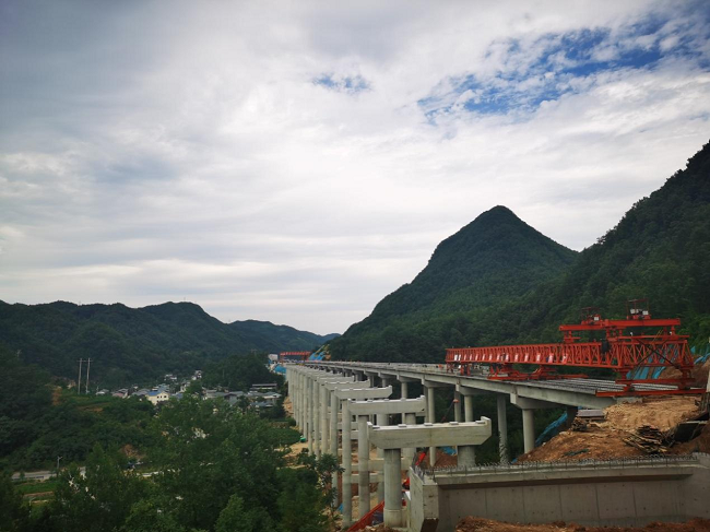 西溝大橋全長510米,預制梁板共計165片。橋梁位于分離式路基段,上跨當地村道和河流,橋梁附近埋設有國防光纜,部分墩柱處于山地陡坎溝壑之間,施工難度大、安全風險高。該橋橋墩采用柱式墩、樁基礎,橋臺采用柱式臺、樁基礎,于5月12日開始架梁,6月21日完工。參建人員克服地質條件復雜、施工場地狹窄、雷雨季節、高墩施工安全風險高等困難,有序推進全橋施工。
