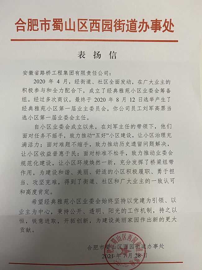 7月30日,公司收到合肥市蜀山區(qū)西園街道辦事處對劉軍同志的表揚信,信中,西園街道辦事處對該同志在經(jīng)典雅苑小區(qū)業(yè)主委員會日常工作及取得成績給予表揚。