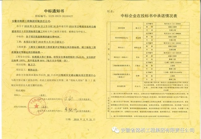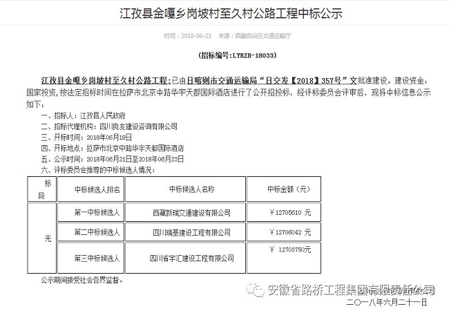 近日,從日喀則市交通運輸局項目管理中心連續傳來好消息,安徽路橋集團在激烈的競爭中,憑借優良的工程業績及管理優勢,力壓群雄,成功中標2018年日喀則市農村公路建設項目E片區招標項目施工,中標金額35900萬元,為公司2018年在西藏地區市場贏得"開門紅"。6月19日,再傳喜訊,西藏新瑞公司成功中標江孜縣金嘎鄉崗坡村至久村公路工程,中標金額為1270.78萬元。這是西藏新瑞公司成立以來首次依靠自身資質中標,是西藏新瑞公司經營工作的一次成功實踐,具有里程碑意義,也為西藏新瑞公司今后在西藏發展積累了寶貴的經驗,奠定了良好的基礎。