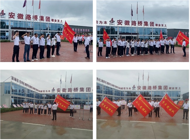 儀式最后,五分公司領導班子分別為項目員工代表授予黨員先鋒隊、工人先鋒隊、青年突擊隊旗幟。項目黨員先鋒隊、工人先鋒隊、青年突擊隊分別進行宣誓,為保證工程建設品質、效率做出了莊嚴且鄭重的承諾。