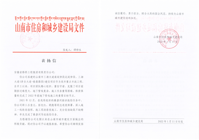 信中指出,由安徽路橋集團承建的山南市三湘大道建設項目自開工以來項目團隊精心組織、重信守諾、攻堅克難,順利的完成了既定節點目標任務。在雅礱河排洪搶險任務中,項目領導班子等同志連夜部署、深入施工一線輪崗指揮,施工現場晝夜施工,堅持缺氧不缺精神、艱苦不怕吃苦,率先完成了雅礱河排洪搶險任務。