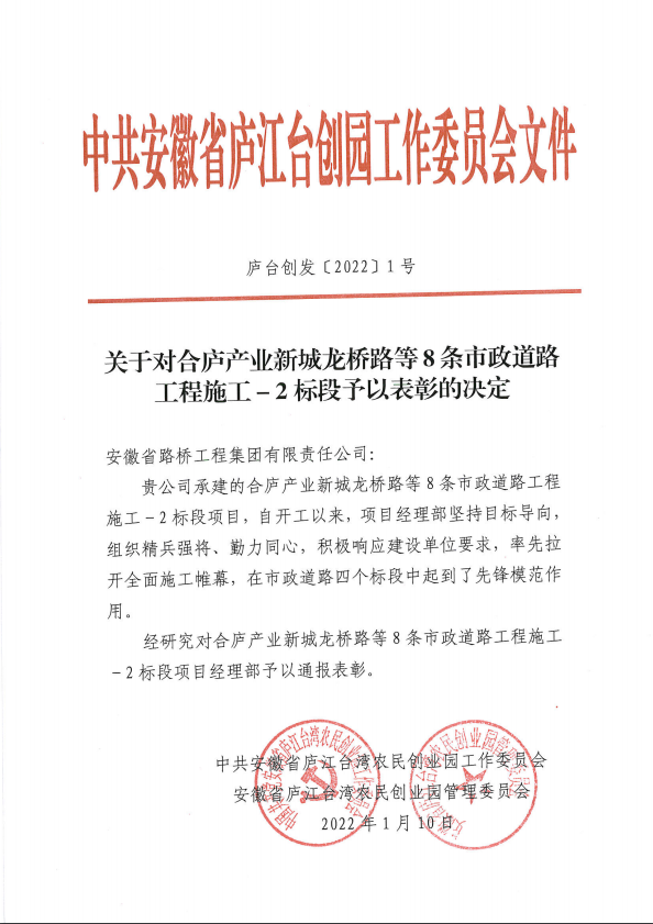 近日,中共安徽省廬江臺灣農民創業園工作委員會和安徽省廬江臺灣農民創業園管理委員會向安徽路橋集團合廬產業新城龍橋路等8條市政道路工程施工-2標段項目發來表彰信,對項目率先拉開全面施工帷幕,在市政道路四個標段中起到先鋒模范作用予以表彰。