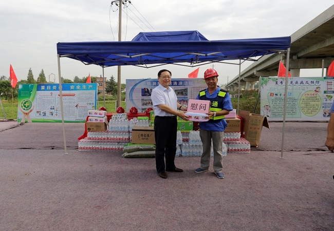 錢總一行來到項部施工現(xiàn)場看望和慰問奮戰(zhàn)在施工一線干部職工,為廣大職工送去藥品、飲料等防暑降溫物品。錢總對安徽路橋集團廣大職工戰(zhàn)高溫、斗酷暑,堅持在一線施工的艱苦奮斗精神給予高度贊揚,對項目部現(xiàn)階段工作給予了肯定,要求項目部要進一步加強管理,做好夏季施工防暑降溫工作,優(yōu)質(zhì)高效推進工程建設(shè)。