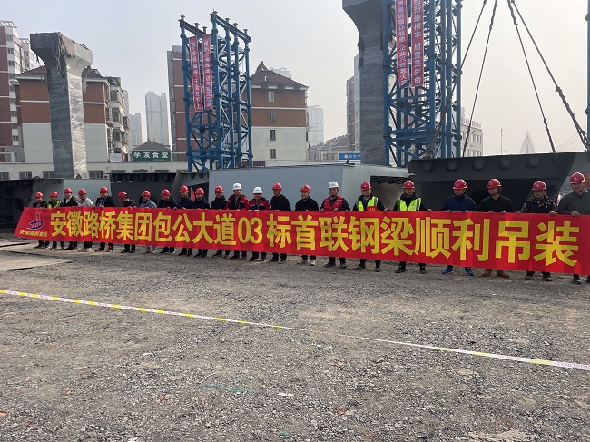 2022年1月17日上午10點58分,經(jīng)履帶式吊車配合,安徽路橋集團包公大道03標項目互通WN、SE匝道鋼箱梁承重支架鋼梁順利架設(shè),標志著鋼梁施工正式啟動。