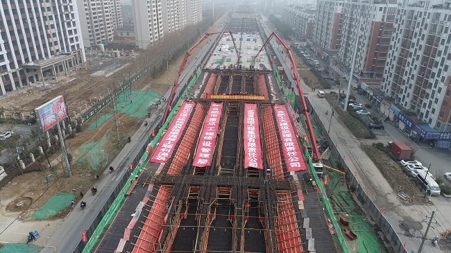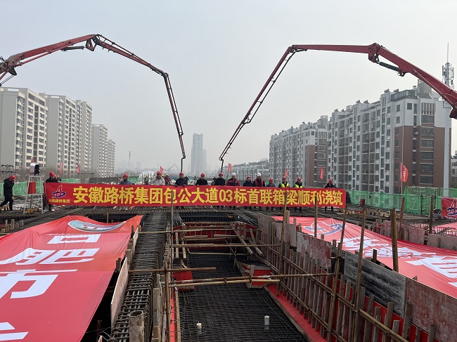 2022年01月17日上午11點28分,包公大道03標項目主線首聯130m箱梁順利開始澆筑,至此項目現澆梁施工生產序幕正式拉開。