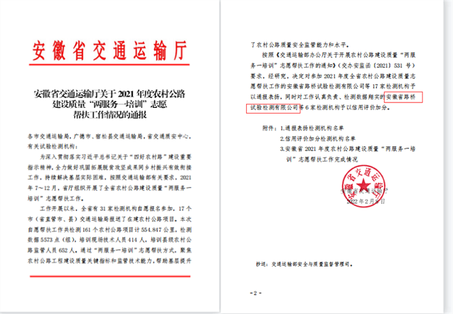 2月8日,安徽省交通運輸廳發布《安徽省交通運輸廳關于2021年度農村公路建設質量“兩服務一培訓”志愿幫扶工作情況的通報》,對檢測公司參與“兩服務一培訓”志愿幫扶工作期間所做出的突出貢獻進行表揚,并給予信用評價加分激勵。
