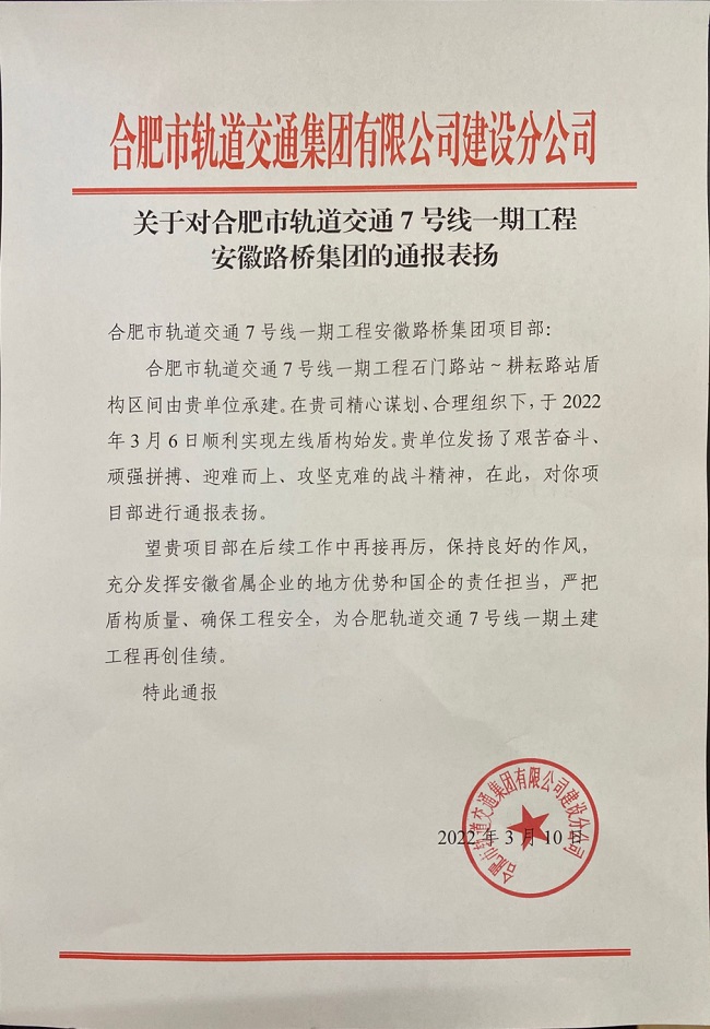 表揚信中指出,在安徽路橋集團軌道交通七號線項目部精心謀劃、合理組織下,3月6日,合肥市軌道交通7號線石門路站-耕耘路站區(qū)間左線“拼搏號”盾構(gòu)機順利始發(fā),充分展現(xiàn)了路橋集團建設者艱苦奮斗、頑強拼搏、迎難而上、攻堅克難的戰(zhàn)斗精神。希望項目部后續(xù)工作中再接再厲,保持良好的作風,充分發(fā)揮安徽省屬企業(yè)的地方優(yōu)勢和國企的責任擔當,嚴把盾構(gòu)質(zhì)量,確保工程安全,為合肥軌道交通7號線一期土建工程再創(chuàng)佳績。