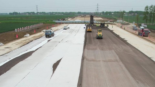 4月13日,G206荊涂大橋至蚌埠宿州交界段一級公路改建工程01標項目順利完成首段水穩底基層試驗段攤鋪。