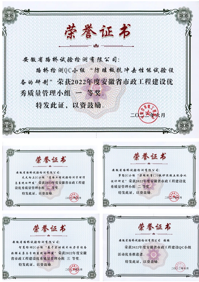 “防眩板抗沖擊性能試驗設備的研制”榮獲2022年度安徽省市政工程建設優秀質量管理小組一等獎;“道路工程試驗檢測管理信息系統的研發”、“梁端配重C30鐵砂混凝土配合比設計研究”榮獲2022年度安徽省市政工程建設優秀質量管理小組二等獎;“基于實時技術的力學設備數據采集與分析系統的研發”榮獲2022年度安徽省市政工程建設優秀質量管理小組三等獎。同時,作為檢測公司QC小組活動的推進者——檢測公司黨總支委員、副總經理張鵬還獲得了“2022年度安徽省市政工程建設QC小組活動優秀推進者”榮譽。