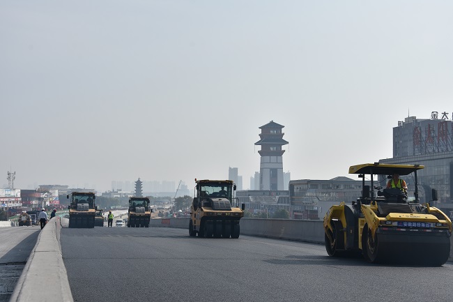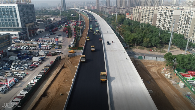 迎賓大道高架橋,作為本項目的控制性工程,為項目最長的一座高架橋,全橋共39跨,其中預制箱梁35跨315片、鋼箱梁4跨48段,該橋全長1272.5米。本次左幅瀝青攤鋪為中面層6厘米厚AC-20C,共計16000㎡。下一步,項目部將進行上面層4厘米厚AC-13C瀝青攤鋪、右幅瀝青攤鋪以及伸縮縫安裝、標線施工、路燈安裝等后續工作。