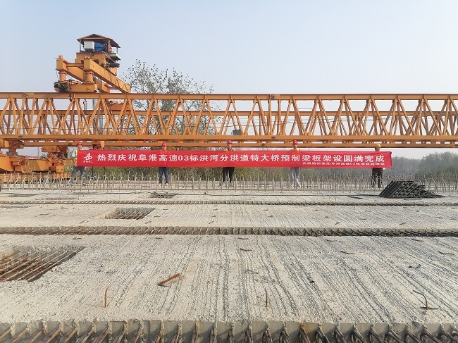10月23日,阜陽至淮濱高速公路安徽段FH-03標圓滿完成洪河分洪道特大橋梁板架設任務。