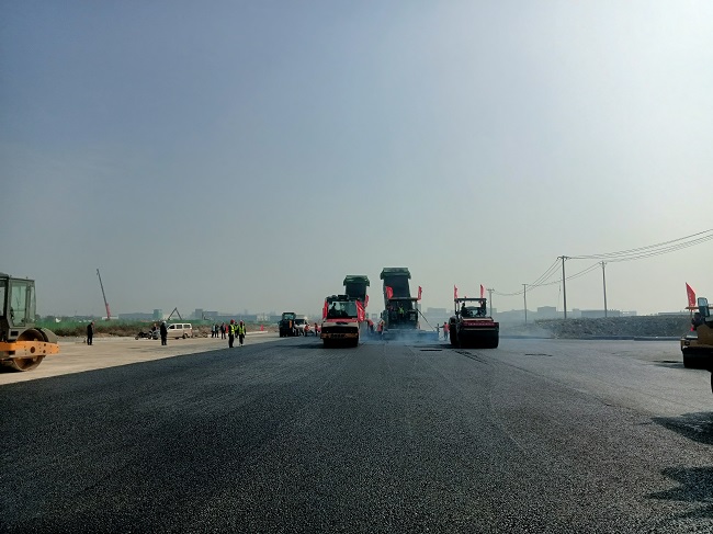 為確保高質量、高標準完成瀝青下面層試驗段攤鋪任務,項目部科學部署,提前組織各部門、施工班組召開安全技術交底會議,對施工作業安全、施工部署、攤鋪工藝流程、控制要點、施工規范等進行詳細交底。瀝青攤鋪過程中,一車車滾燙的瀝青料傾倒在攤鋪機料斗中,各式壓路機緊跟其上,調平、修邊、碾壓、收面,工人們認真進行每一項工序,監理工程師和現場技術人員時刻關注混合料攤鋪溫度、碾壓溫度、攤鋪速度、碾壓次數等各個施工工序質量,同時通過測量記錄壓實設備機具組合方式、混合料溫度(出廠、到場、攤鋪、碾壓)、松鋪厚度、碾壓遍數、壓實度等指標,確保試驗段施工銜接有序,一次成型。