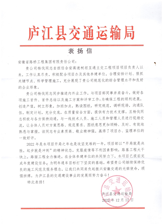 近日,合肥市廬江縣交通運輸局向路橋集團發(fā)來表揚信,對合安高速柯坦互通項目在建設(shè)中展現(xiàn)出的科學(xué)管理、國企擔(dān)當(dāng)及項目班子建設(shè)給予高度肯定和表揚。