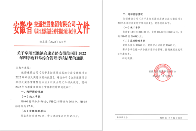 近日,阜淮高速項(xiàng)目辦組織阜淮高速項(xiàng)目、中心實(shí)驗(yàn)室、監(jiān)理公司等開(kāi)展第四季度日常綜合管理考核活動(dòng),阜淮高速03標(biāo)項(xiàng)目綜合評(píng)分再次喜獲“第一名”的好成績(jī)!同時(shí)也成為該工程項(xiàng)目自開(kāi)工以來(lái),唯一一個(gè)連續(xù)三次榮獲季度評(píng)比第一名的標(biāo)段。