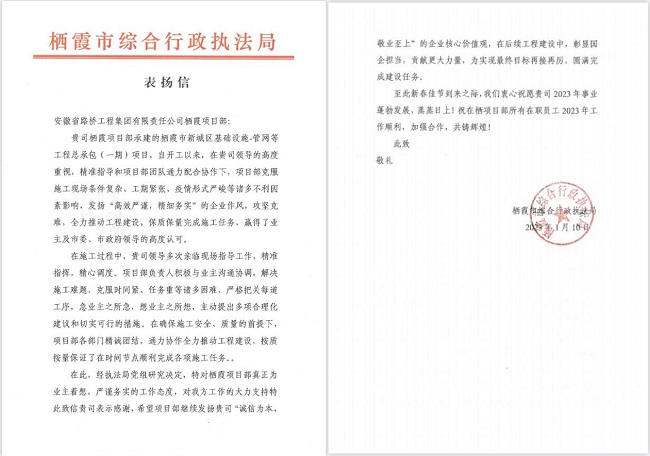 表揚(yáng)信既是對(duì)項(xiàng)目全體參建人員辛勤工作的肯定,也是對(duì)新的一年工作的激勵(lì)。安徽路橋集團(tuán)項(xiàng)目建設(shè)者將以此為契機(jī),在后續(xù)的工作中再接再厲,一如既往地發(fā)揚(yáng)勇挑重?fù)?dān)、敢打硬仗優(yōu)良作風(fēng),全力以赴,攻堅(jiān)克難,保質(zhì)保量能完成各項(xiàng)施工任務(wù)。