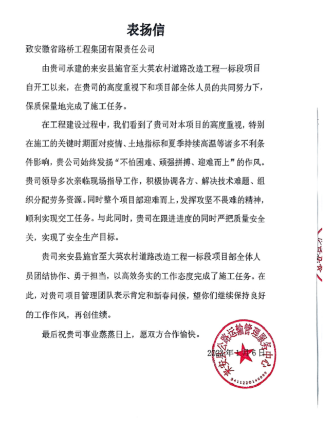 2023年1月6日,六分公司來安縣施官至大英農村道路改造工程一標段項目收到來安縣公路運輸管理服務中心發來的表揚信。